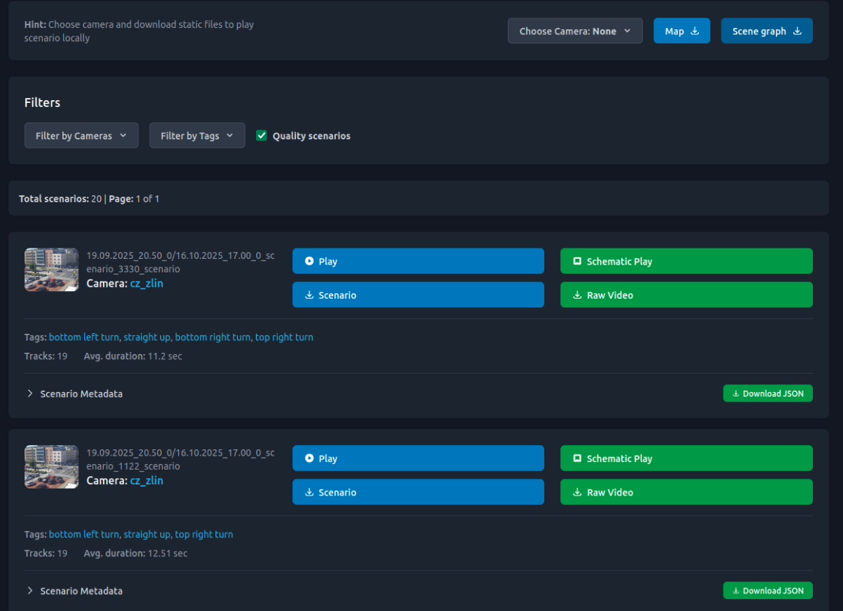 Filter by cameras, tracks number, scenario length, maneuver features.